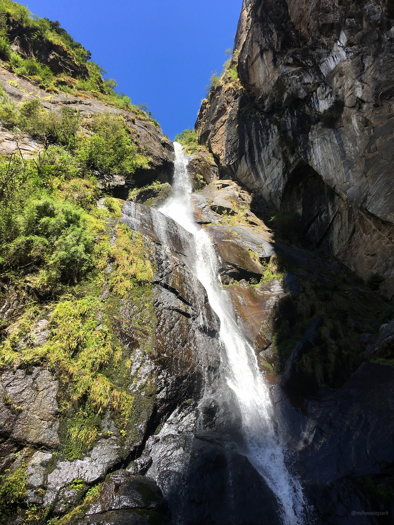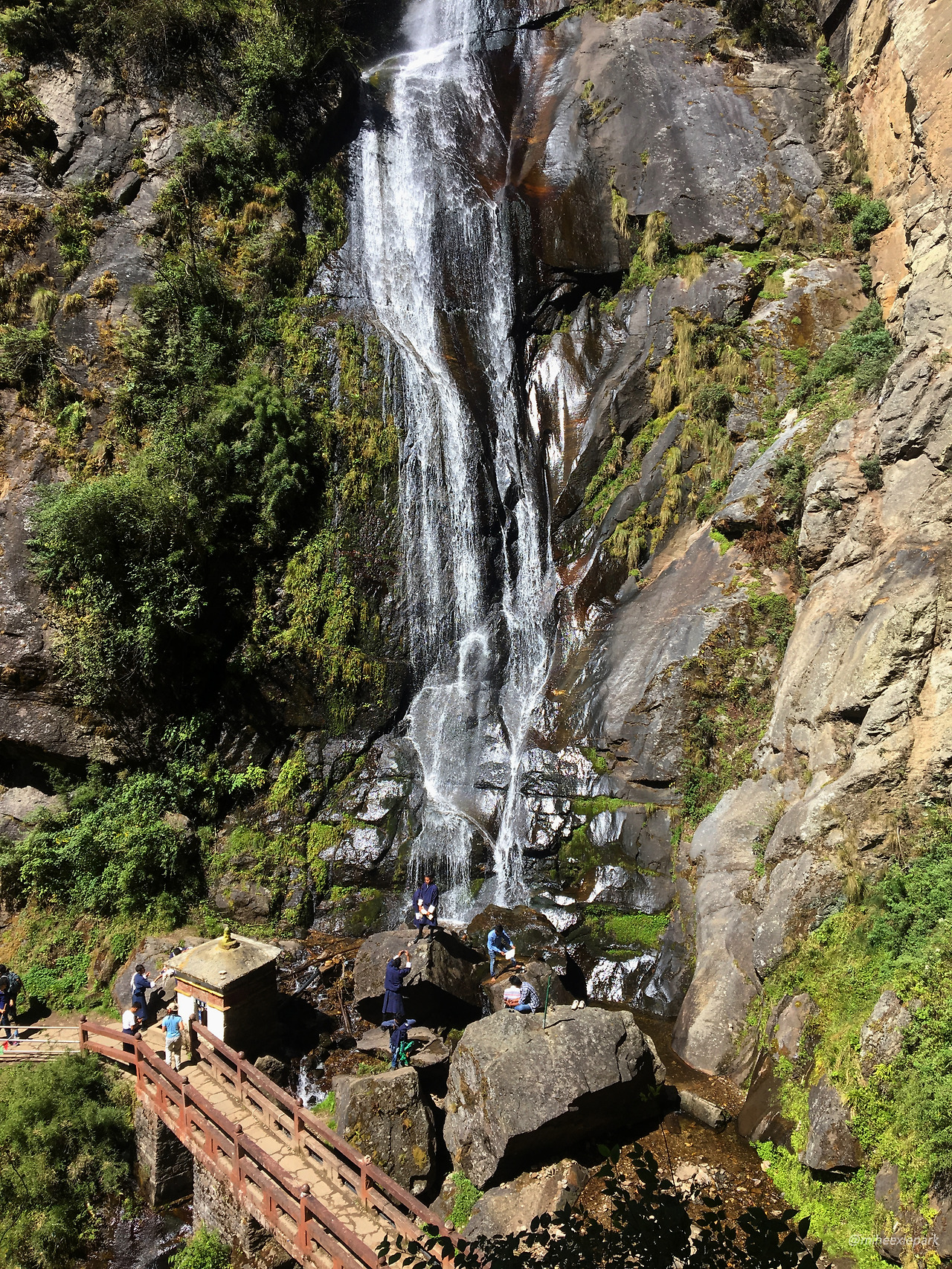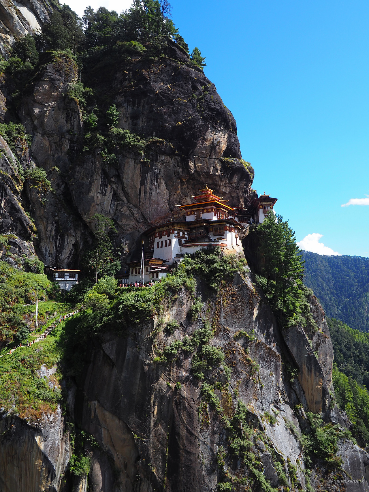 전체적인 코스를 보니 옆 봉우리를 넘어서 가는 구조다. 옆 봉우리를 돌아서 아래로 내려간 다음에 다리를 건너서 다시 사원이 있는 바위산으로 올라가는 코스다. 두 봉우리 사이에는 긴 폭포가 있다. 아직은 건너편에 사원이 있지만 목적지를 마주 볼 수 있는 높이에 다다르자 무사히 잘 다녀올 수 있을 것 같다는 생각이 들었다.