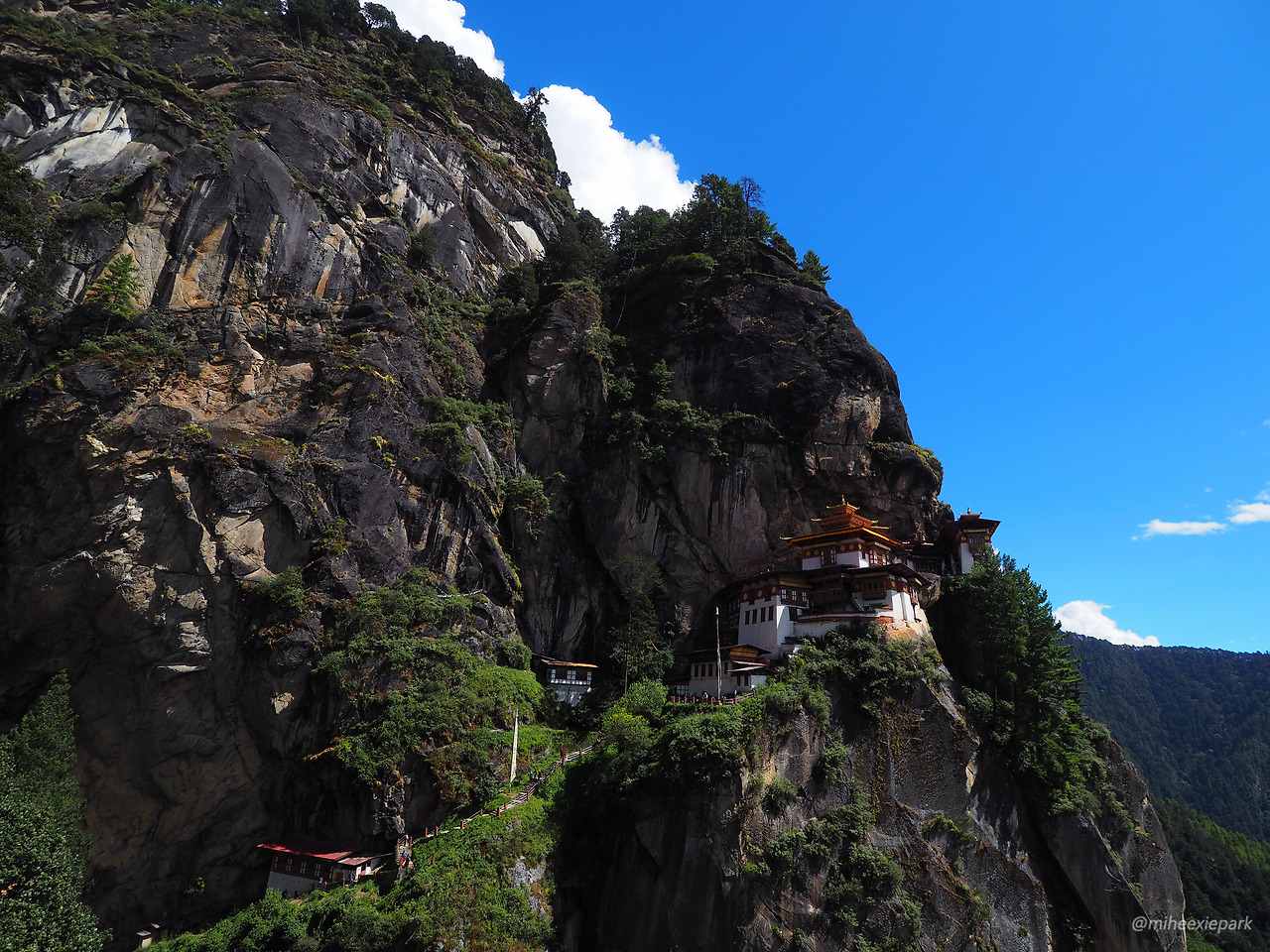 도마는 이리저리 옮겨 다니며 파드마삼바바에 대해 설명해주었다. 매번 깍듯이 인사를 드리고 공양을 하는 것도 잊지 않았다. 사실 불교 이야기는 귀에 잘 들어오지 않았다. 이런 사원이 있다는 자체가 요지경이었기 때문이다. 재이는 아직 지식이 너무 얕다며 좀 더 이해한 뒤에 다시 왔으면 좋겠다고. 존재만으로도 신비한 사원은 하이라이트가 될 수밖에 없는 요물이었다. 농담처럼 내게도 태워다 줄 호랑이가 필요하다고 말했는데, 모두의 도움으로 눈부신 풍경을 보고 가는구나. 왔던 길로 되돌아가야 하지만 오르막보다 내리막이 더 기니까 뭐 괜찮겠지.