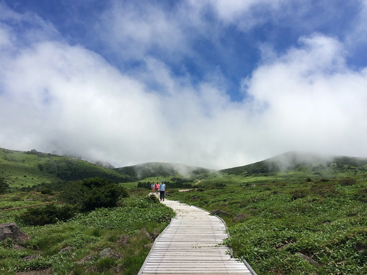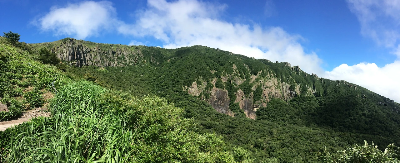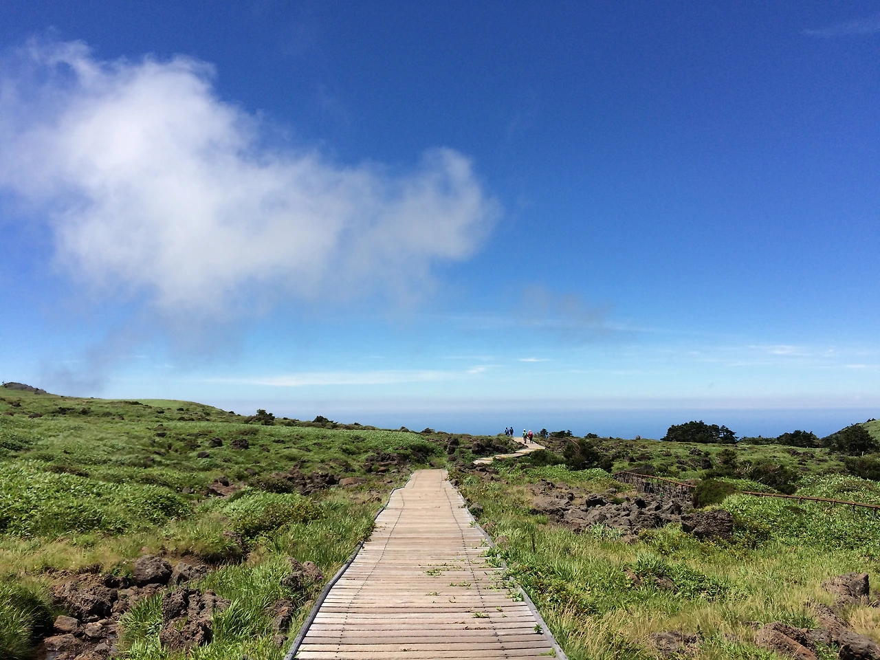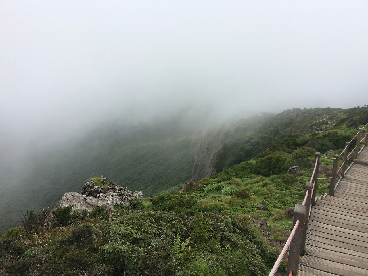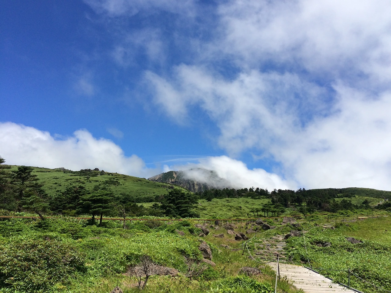 바람에 맞춰 들썩이는 모자를 붙잡은 채 등산로를 걷는다. 완전히 다른 세상에 와 있는 것만 같다. 이렇게 생기 있고 따뜻한 초록이 있을까. 백록담의 옆모습이 보여서 또 만세. 어느새 구름에 가려졌지만, 얼굴을 비춰준 것만으로도 고맙다.