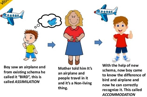 피아제는 아이가 이해하고 있는 세상을 ‘도식’이라고 표현했다. 아이들은 자신만의 도식 속에서 나름 체계를 가지고 있다. 예를 들면 ‘네 발을 가지고 갈색 털을 가진 동물은 고양이다’라는 도식을 가지고 있다고 하자. 이 아이는 그 도식 안에서 여우를 봤을 때 고양이라고 생각하며 세상을 바라보는 것이다. 그리고 이렇게 기존에 자신이 가지고 있는 도식 속에서 이해하는 것을 ‘동화’라고 한다.