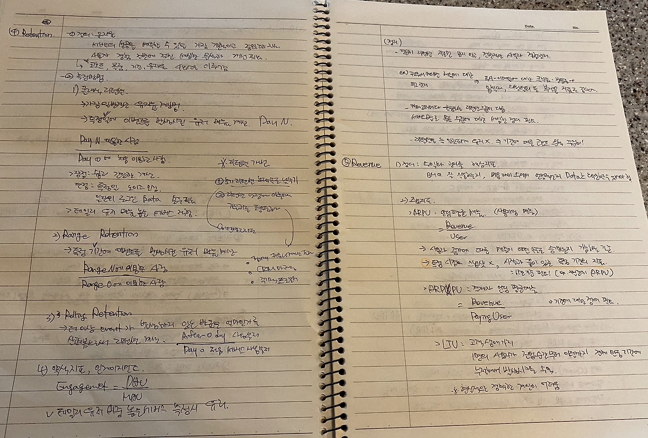 개인적으로는 5장에서 다룬 '데이터 파이프라인 구축'과 'AB 테스트'에 대한 실무 경험이 전무하다 보니 이해도가 많이 떨어졌고, 나머지 내용은 기획자-마케터-운영 등 어느 정도의 서비스 경험만 있다면 무리 없이 소화할 수 있습니다. 개념 정의는 물론 저자의 실무 노하우까지 정리가 잘 되어있어서 진짜 오랜만에 공책에 손글씨로 쓰면서 읽었는데요. 제가 필기 노트에 정리한 내용 위주로 소개해 봅니다