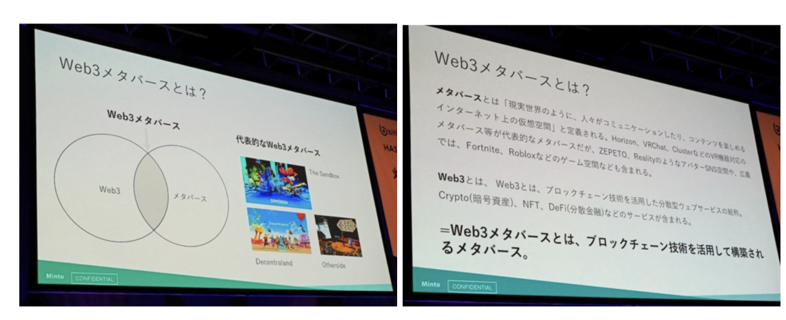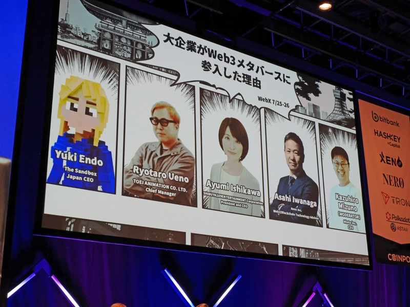 이번 세션은 일본을 대표하는 전통 IP 강자 에이벡스(AVEX), 토에이 애니메이션(TOEI Animation), 시부야 109 (SHIBUYA109)와 메타버스 플랫폼을 리딩하는 샌드박스 재팬 (Sandbox Japan)이 패널로 나서 더욱 관심이 갔습니다. 이들 세 회사는 모두 The Sandbox와의 제휴를 통해 메타버스 사업을 확장한 공통점이 있습니다. 이전에는 Web3와 메타버스를 별도의 섹터로 바라봤었는데, 아예 Web3 메타버스라는 정의로 두 개의 키워드를 하나로 묶어 접근하는 관점이 신선했습니다. 아울러 기존 IP 강자들이 어떠한 계기로 Web3 메타버스에 진출하게 되었는지, 그 과정에서 어떠한 노력과 어려움이 있었는지 생생한 현장의 목소리로 전달해 주었습니다.