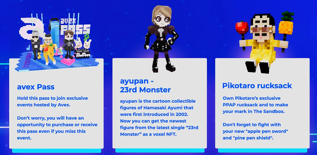 일본 최대 종합 엔터테인먼트사인 에이벡스는 새로운 것에 적극적으로 도전하는 사풍을 갖고 있음. The Sandbox와의 제휴 또한 마츠우라 마사토 현 대표이사 겸 회장의 적극적인 지원으로 진행할 수 있었음