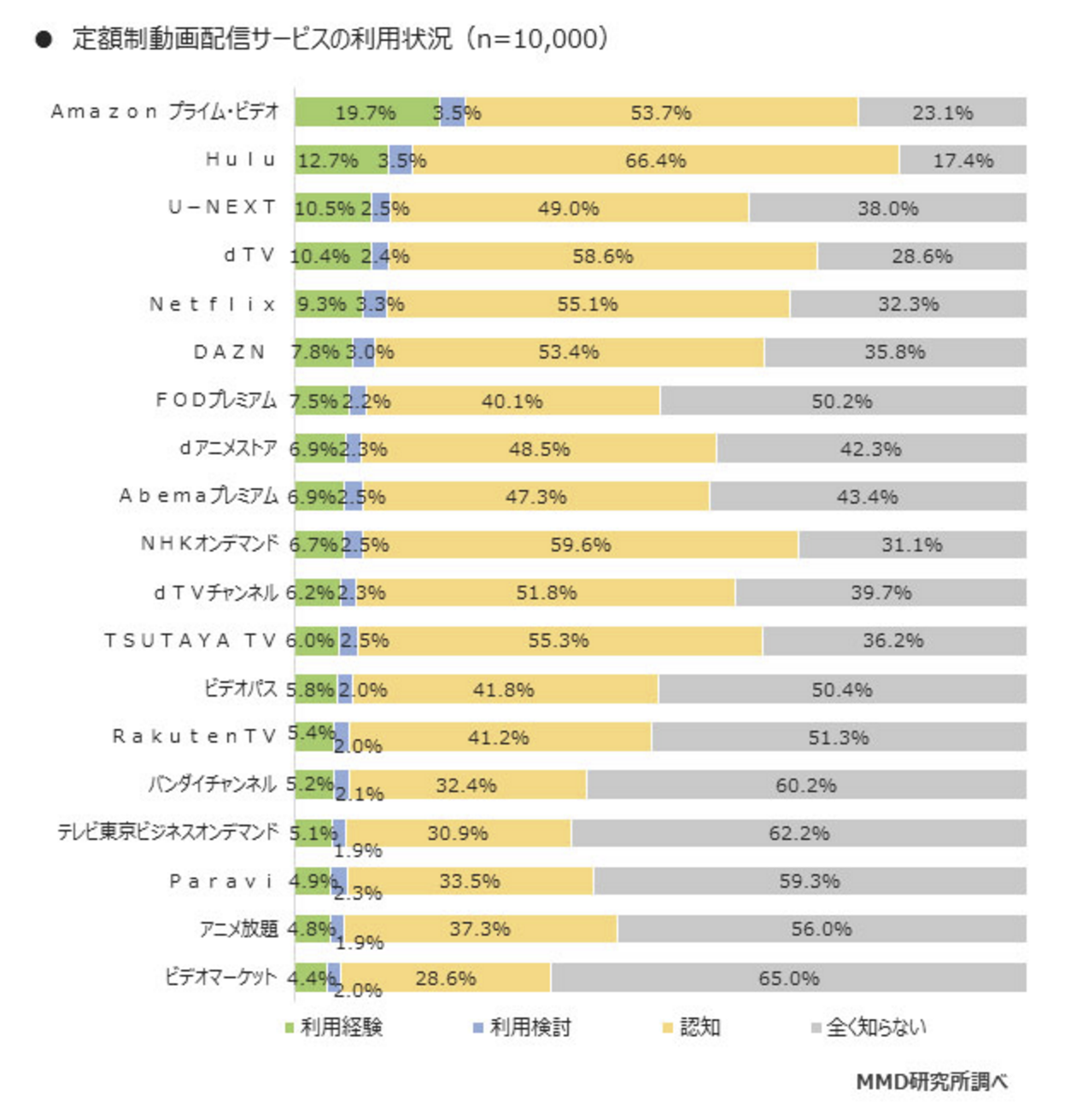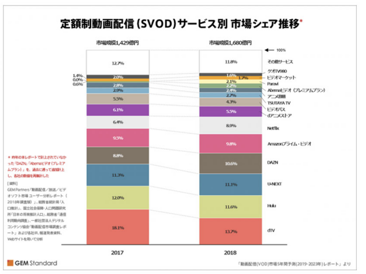 2018년 기준의 시장 조사에 따르면, SVOD 점유율 1위는 dTV (NTT 통신사 계열 동영상 서비스) 였지만 넷플릭스, 아마존 프라임 등의 기세에 국내 플랫폼은 점점 힘을 잃어가고 있다. 최근 오리지널 시리즈 <전라 감독>의 인기로 일본 내 넷플릭스 유료 가입자 수는 300만 명을 넘었고, 몇몇 리서치 업체의 올해 발표를 보면 이용률 1위는 아마존 프라임이 차지하고 있다.
