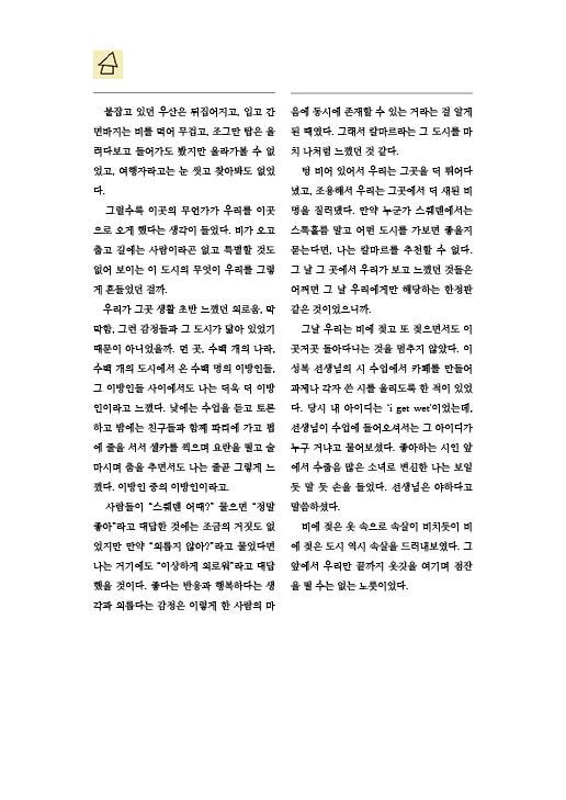 우리가 그곳 생활 초반 느꼈던 외로움, 막막함, 그런 감정들과 그 도시가 닮아 있었기 때문이 아니었을까. 먼 곳, 수백 개의 나라, 수백 개의 도시에서 온 수백 명의 이방인들, 그 이방인들 사이에서도 나는 더욱더 이방인이라고 느꼈다. 낮에는 수업을 듣고 토론하고 밤에는 친구들과 함께 파티에 가고 펍에 줄을 서서 셀카를 찍으며 요란을 떨고 술 마시며 춤을 추면서도 나는 줄곧 그렇게 느꼈다. 이방인 중의 이방인이라고.