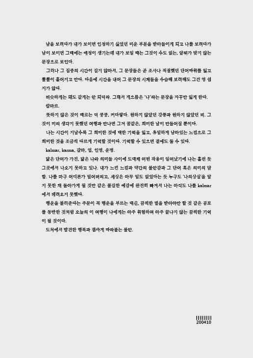 사람들이 “스웨덴 어때?” 물으면 “정말 좋아”라고 대답한 것에는 조금의 거짓도 없었지만 만약 “외롭지 않아?”라고 물었다면 나는 거기에도 “이상하게 외로워”라고 대답했을 것이다. 좋다는 반응과 행복하다는 생각과 외롭다는 감정은 이렇게 한 사람의 마음에 동시에 존재할 수 있는 거라는 걸 알게 된 때였다. 그래서 칼마르라는 그 도시를 마치 나처럼 느꼈던 것 같다.