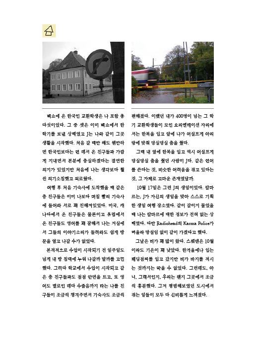 벡쇼에 온 한국인 교환학생은 나 포함 총 다섯이었다. 그중 셋은 이미 벡쇼에서 한 학기를 보낸 상태였고 J는 나와 같이 그곳 생활을 시작했다. 처음 갈 때만 해도 웬만하면 한국인보다는 먼 데서 온 친구들과 가깝게 지내면서 본분에 충실하겠다는 결연한 의지가 있었지만 처음에 나는 생각보다 훨씬 의기소침했고 외로웠다.