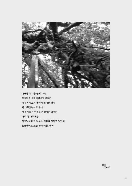 덕분에 얽힌 가지들이 나무 밑동 주변에 조그마한 공간을 만들고 있었는데 그 사이를 비집고 들어가 보니, 나무 입장에서의 행복은 잘 몰라도 내 입장의 행복을 맛볼 수 있었다. 비와 추위를 피해 잠시 몸을 숨길 수 있는 아늑한 공간이었으니까. 누가 어떻게 붙인 이름인지 모르겠지만, 어쩌면 너무 안 행복해 보여서 붙여준 이름일지도 모르지만, 그 날 내 입장에서는 그 이름을 조금 이해할 수 있었다.