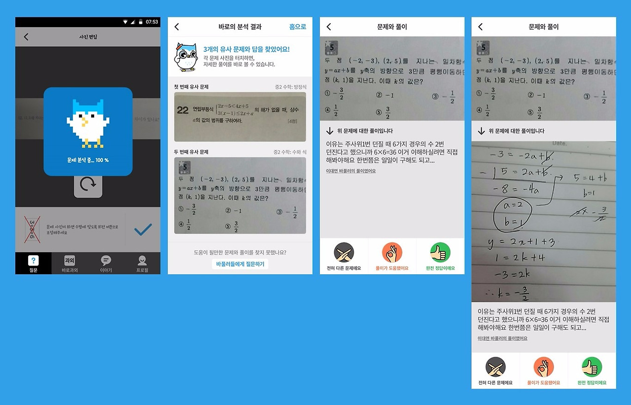사실 현재로서 제일 뿌듯한 것은, 그 밑에 깔린 기술이 얼마나 복잡한 것이든 관계없이 유저들이 보는 화면에는 귀여운 부엉이가 뛰어놀고 있다는 것이다(문제 검색에 걸리는 3초 정도의 시간 동안 바로풀기의 캐릭터인 부엉이 ’바로'가 날갯짓을 하는 애니메이션이 나온다) 설득력 있고 친절한 기술, 하나의 인격체 같은 기술을 만들겠다는 것이 가장 중요하게 생각했던 부분이고 그래서 이렇게 부엉이를 매개로 유저와 만난다는 것이 솔직히 가장 기분 좋다. 구글에서는 비둘기가 검색 결과를 찾아준다면 우리는 부엉이가 풀이와 답변을 다 찾아준다.