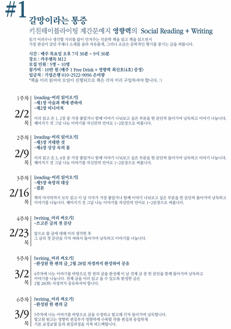 이번 소셜리딩+라이팅 모임은 말 그대로 함께 읽고 써보기 위한 모입니다. 혼자서 읽기 어려운 책을 같이 읽고, 혼자서 정리하기 어려운 생각을 같이 말로 또 글로 정리해보고 싶은 분들 함께 해주세요.