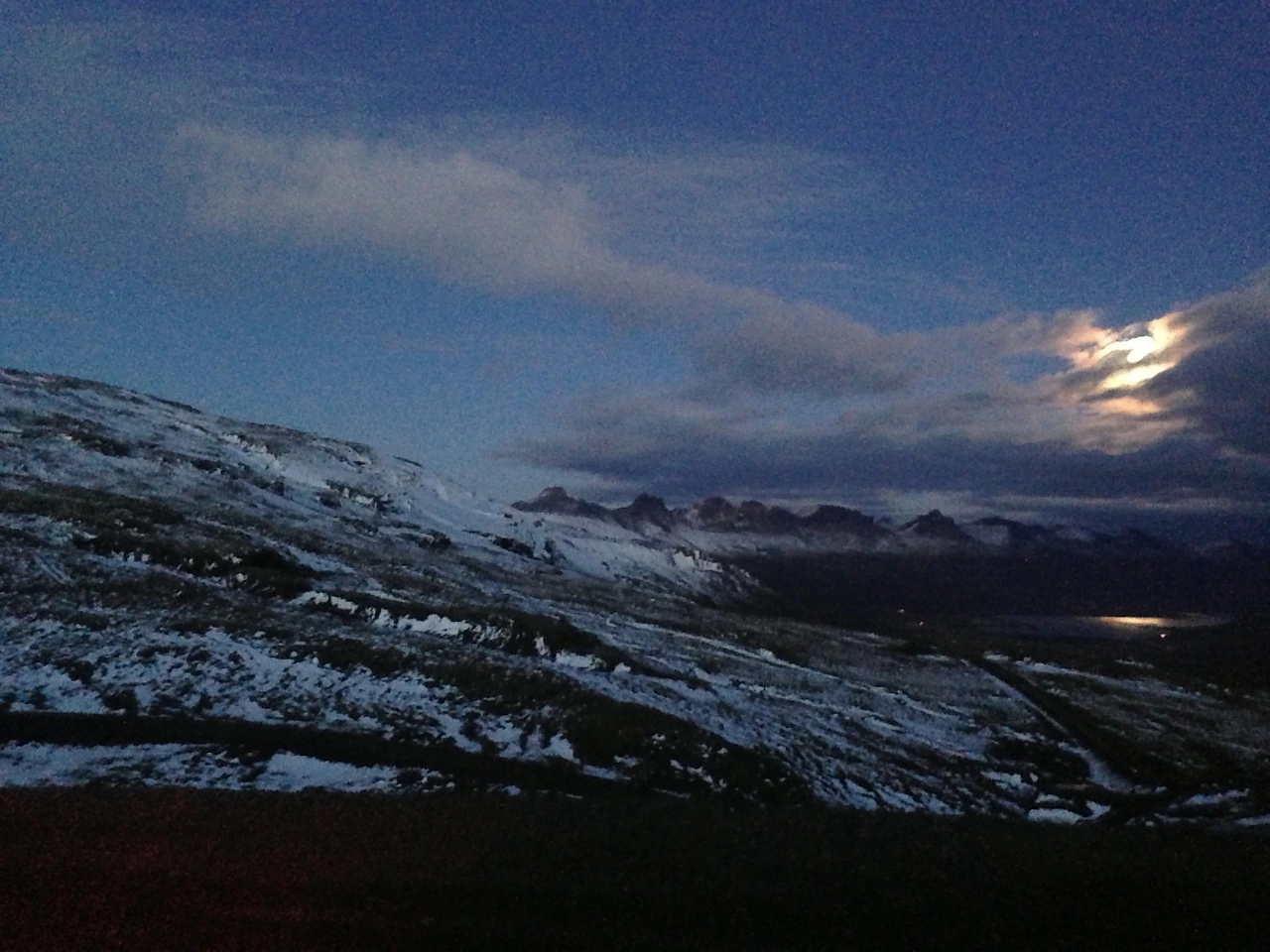 인적 드문 곳에 간간이 집들이 있고 우리 숙소들은 대체로 인적이 드문 곳에 있었으므로 급한 마음에 완만하고 둘러가는 길 대신 험해 보이지만 가까운 길을 선택했는데, 조금 가다 보니 금세 눈 덮인 산이 시작됐다. 그 길에 진입했을 때는 이미 한쪽에서 달이 떠오르고 있을 만큼 꽤 어둑어둑했다. 그나마 추석 연휴를 끼워서 여행을 갔기 때문에 보름달에 가까워지고 있던 달빛과 산을 덮고 있는 눈이 어두운 설산에 빛을 보태고 있었다.