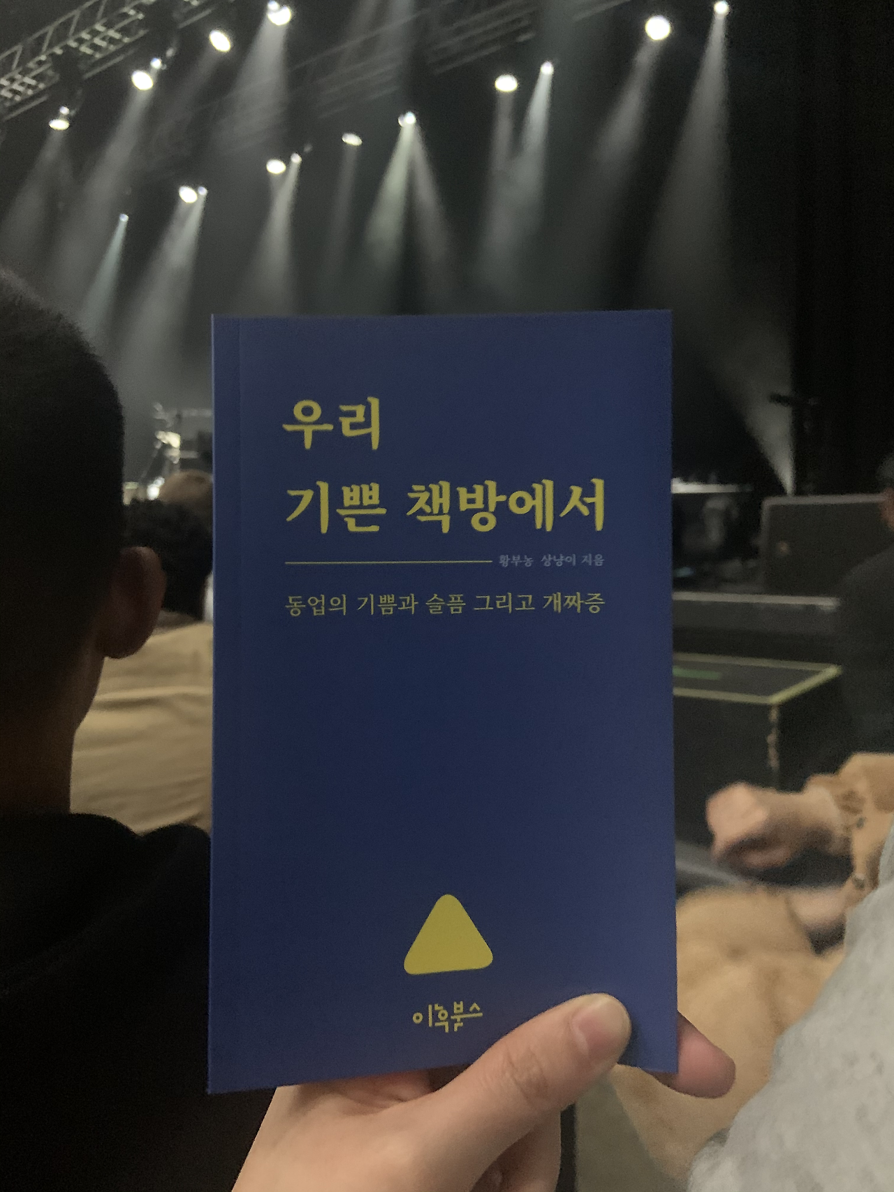 오늘 공연은 같이 보러 가기로 한 친구가 해외 출장으로 오지 못해 혼자 보러 갔다. 무려 스탠딩 11번을 예매해놓고도 왠지 혼자 가서 오래 기다리기 싫어 공연 20분 전쯤 공연장에 도착했다. 시작하기를 기다리면서 읽으려고 아주 얇고 유쾌한 책 한 권을 가져갔다. 이후북스 두 사장님들의 동업 이야기를 다룬 책방 일기 <<우리 기쁜 책방에서>>라는 책이었는데, 공연 시작 전과 break time 동안 시간 가는 줄 모르고 너무 재미있게 읽었다. 유쾌한 나머지 혼자 왔다는 기분도 잊을 수 있었다.