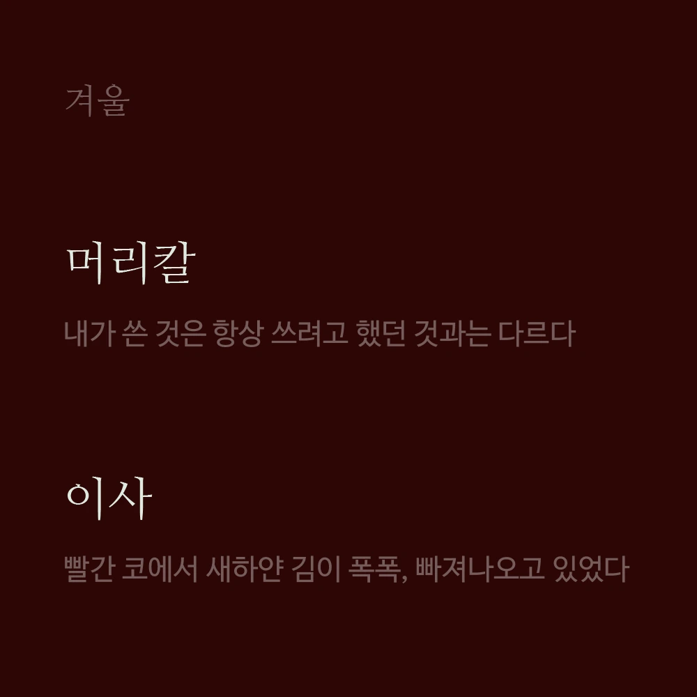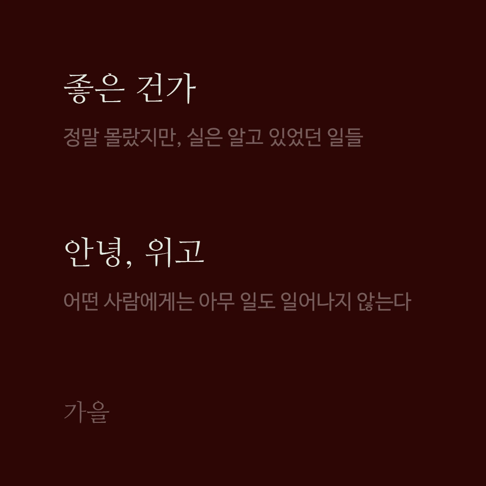 독립문예지 《영향력》 편집인이자 발행인인 은미향이 ‘키친테이블라이팅 계간문예지’ 《영향력》에 발표했던 9편의 단편소설을 엮고, 각 소설의 배경이 되는 계절별로 묶었습니다.