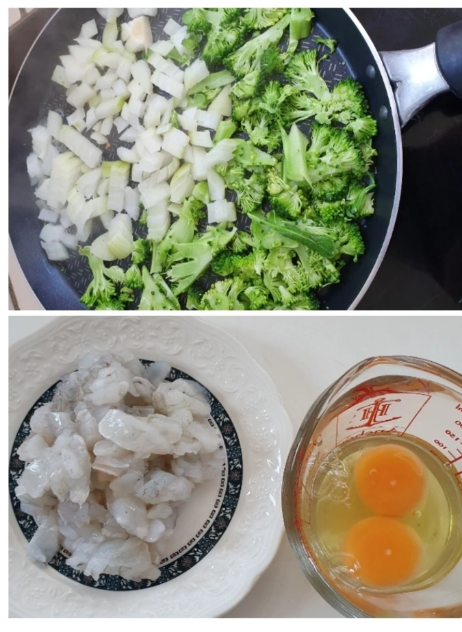 3. 브로커리와 양파 그리고 닭가슴살은 미리 프라이팬에 볶아 주고... 새우는 미리 볶지 말고 식감이 있는 정도로 썰어주고 계란 3개를 미리 풀어주어요.