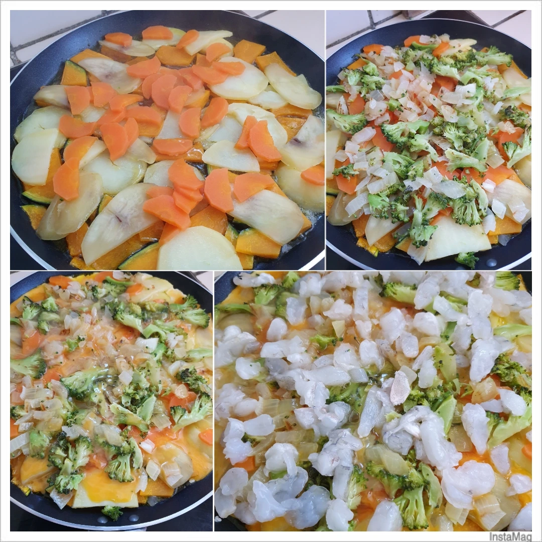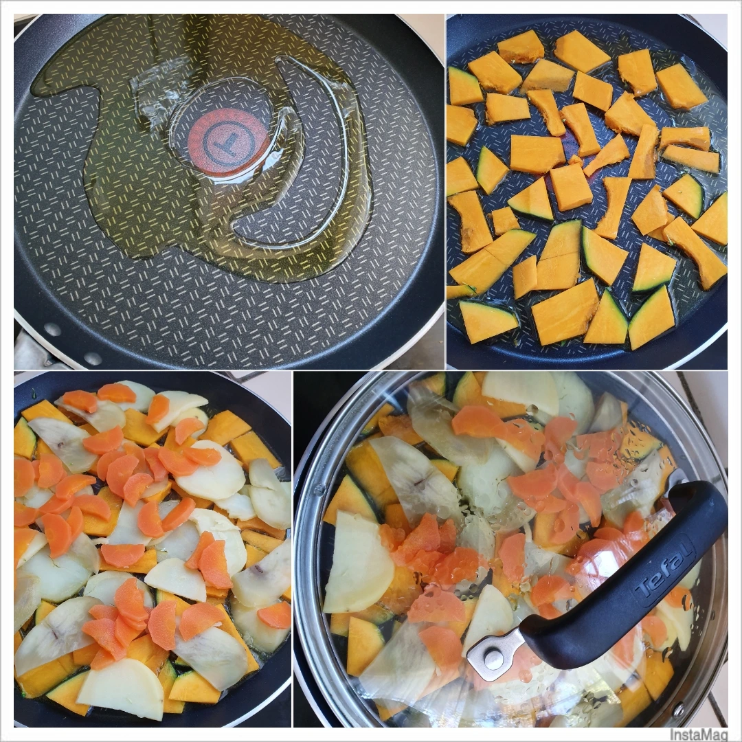 2. 프라이팬에 식용유를 넉넉하게 두르고 이미 익은 감자, 호박, 당근, 고구마를 빽빽하게 깔아주고 뚜껑을 닫고 살짝 한번 더 익혀주어요.