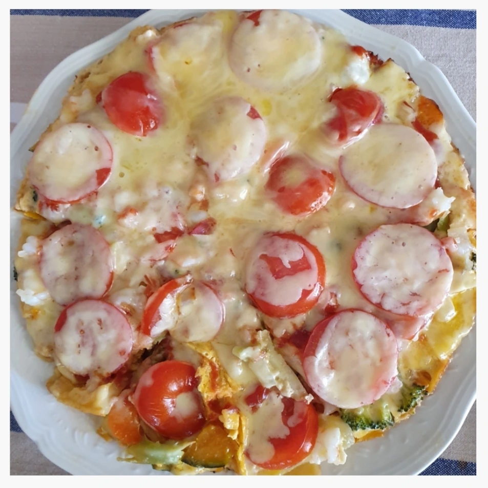 5. 케첩을 취향껏 뿌려주고 토마토를 보기 좋게 올려준 후에 치즈를 얹고 치즈가 녹을 정도로 익혀주면 돼요...