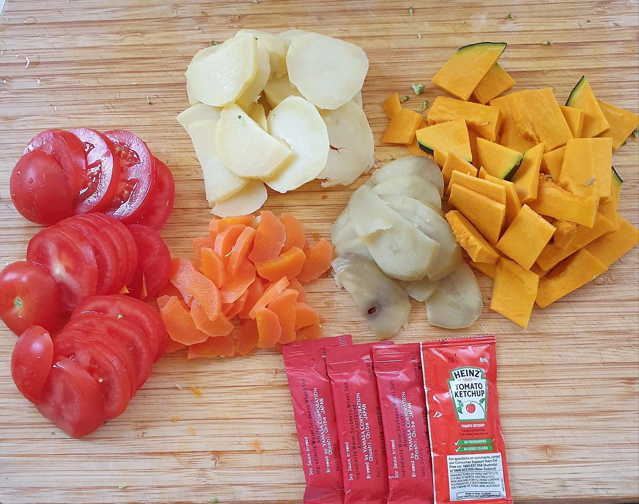 1. 고구마, 감자, 호박, 당근은 미리 살짝 쪄서 납작하게 썰어주어요~