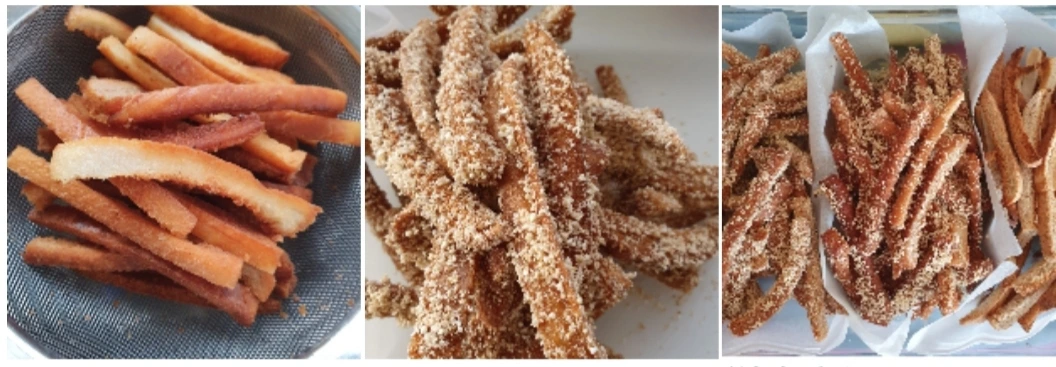 튀긴 후에 기름을 쪽 빼고 뜨거울 때 설탕 옷을 입히면 잘 붙어서 훨씬~~ 맛있답니다.