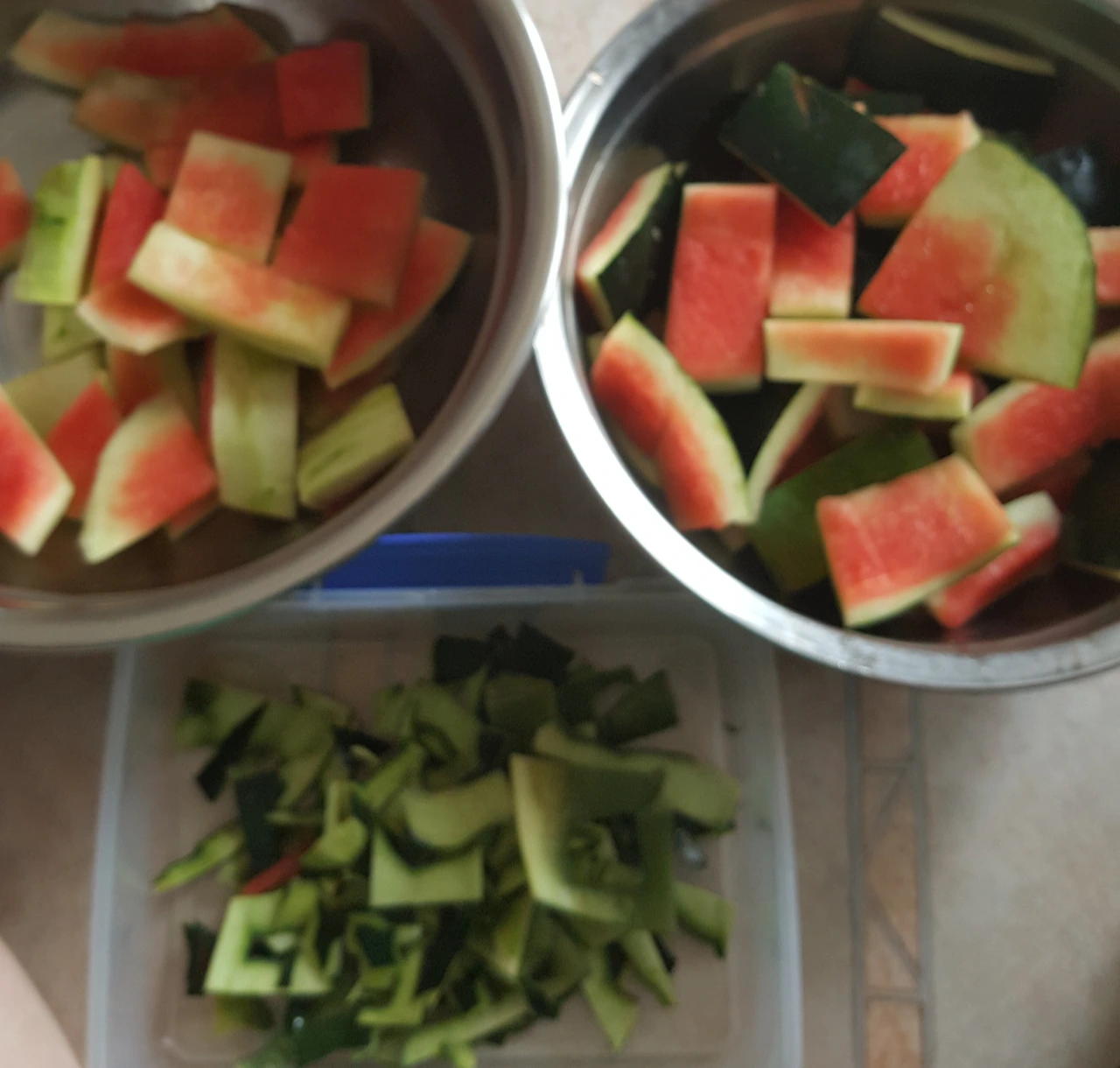 수박을 빠알간 속을 발려놓고 껍질만 따로 모으고 겉껍질까지 먹으면 좋은데...