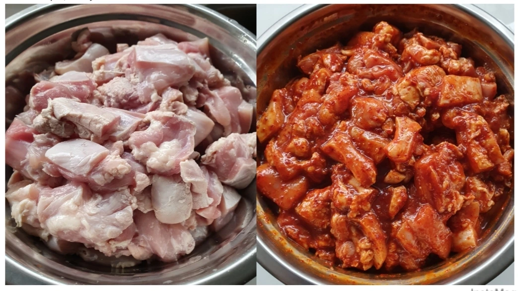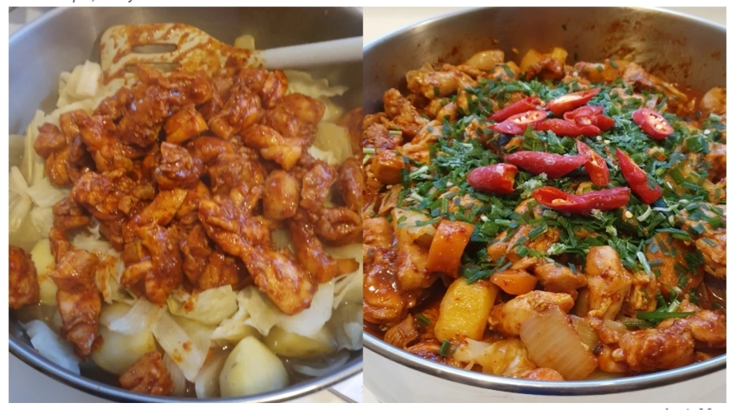 그럼에도 닭다리나 닭한마리로 굳이 요런 스타일을 원한다면... 고기를 먼저 어느정도 익혀주고 양념하고 30분정도 재어두었다가 볶아주는 것을 추천합니다 ^*^ 양념을 한 후에 이런 식으로 익혀주려고 한다면 불맛은 포기하고 물을 조금 넣고 뚜껑을 닫고 익여주시고...