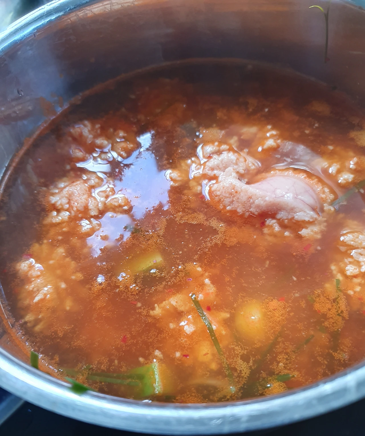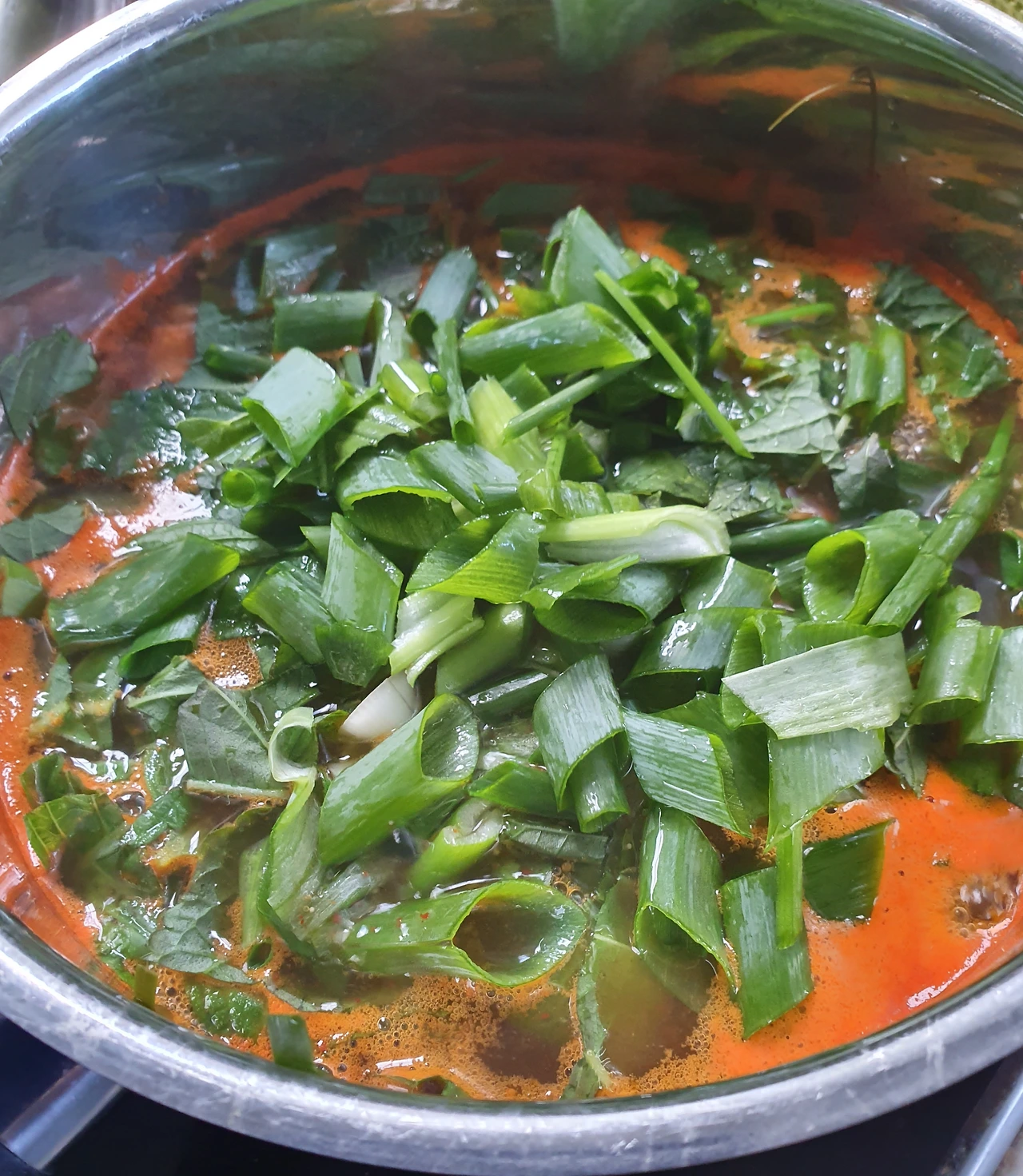 4. 알을 넣고 한번 끓여주고... 대파와 깻잎을 마지막으로 넣고 끓여주어요~