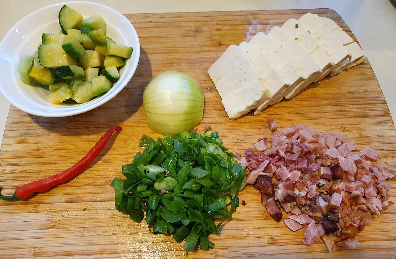 1. 지난여름 텃밭에서 키워 냉동실에 썰어 보관했던 호박과 텃밭에서 따온 고추 그리고 파... 냉동실에 소분해서 두었던 크리스마스 햄과 마트에서 사 온 양파 그리고 먹고 남은 두부... 오늘의 재료입니다.