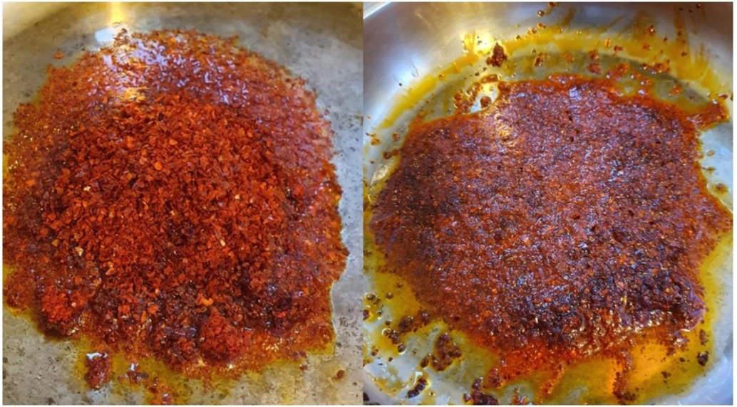 2. 냄비에 식용유 2 Tbs과 고춧가루 3 Tbs을 넣고 볶아주며 고춧기름을 내고....