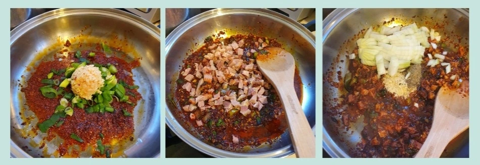 3. 마늘 1 Tbs, 대파 반개를 넣고 볶아주고 파 기름을 내주고 햄 또는 돼지고기 간 것에 양파와 만능 조미료 그리고 굴소스, 간장, 맛술, 멸치액젓을 넣고 볶아준다. (중 약불로 타지 않게 볶는다.)