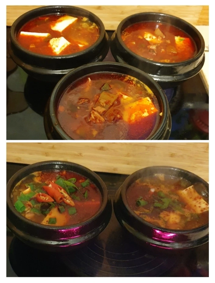5. 푹 익었으면.... 뚝배기에 나누어 담고... 두부와 남은 파를 넣고... 매운맛을 원하면 개별적으로 청양고추를 넣어주고 한번 끓여준 후 계란을 가운데 넣고 후루룩 끓여주면 된다.