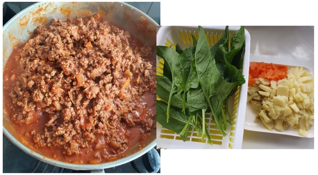 5. 졸여준 소고기와 텃밭에서 키운 시금치 그리고 익혀두었던 감자와 고구마, 당근도 썰어주었어요.