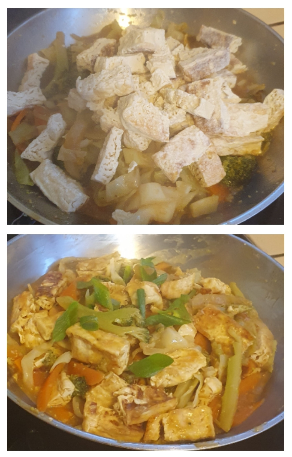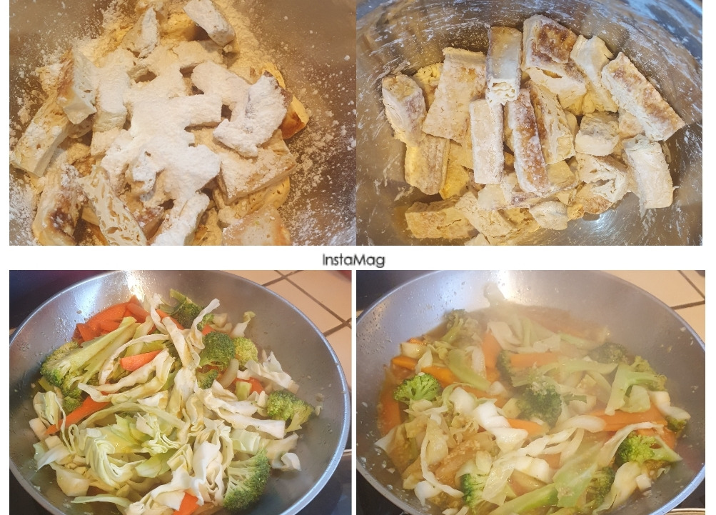 3. 먹기 좋은 크기로 썰어놓은 두부에 옥수수가루 혹은 감자 전분을 조금 넣고 버무려 놓고, 나머지 야채를 취향에 맞게 볶아주세요. 저희는 모두 치아가 별로라서 아주 푹 익혔어요