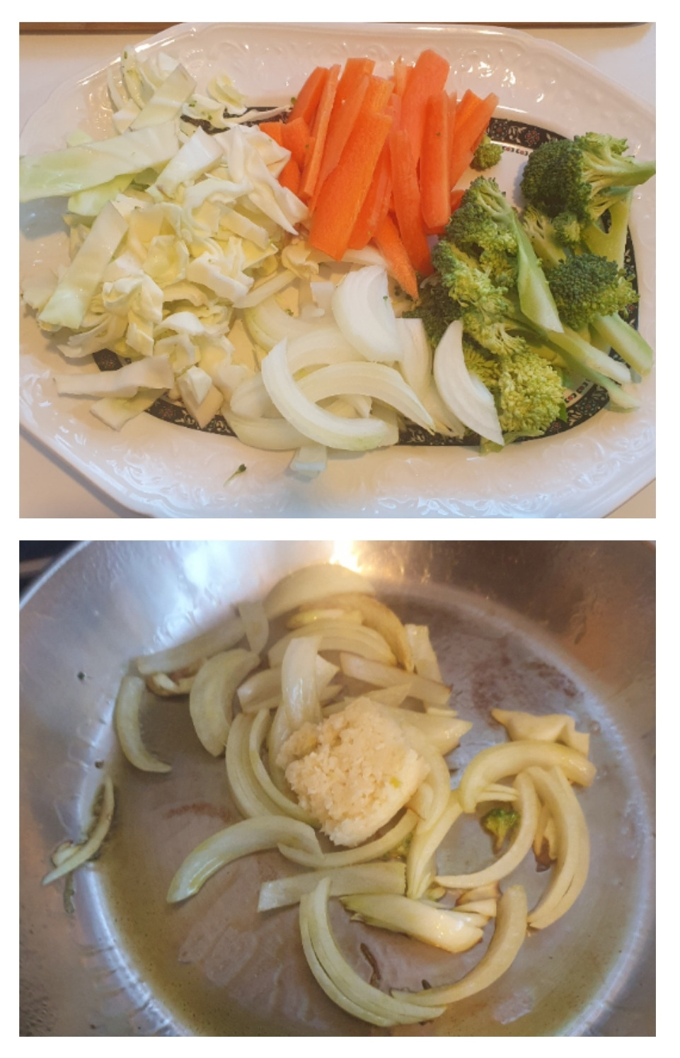 2. 야채는 있는 것으로 하면 됩니다~ 달구어진 프라이팬에 기름을 서너 바퀴 두르고 양파와 파를 넣고 파기름을 내듯이 볶아주다가 마늘을 넣고 마늘이 노릇노릇할 때까지 볶아주어요~