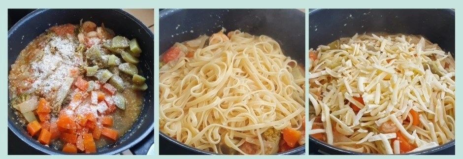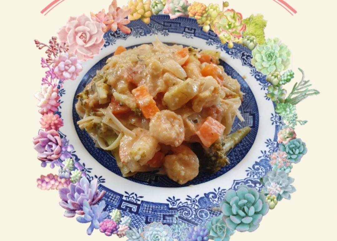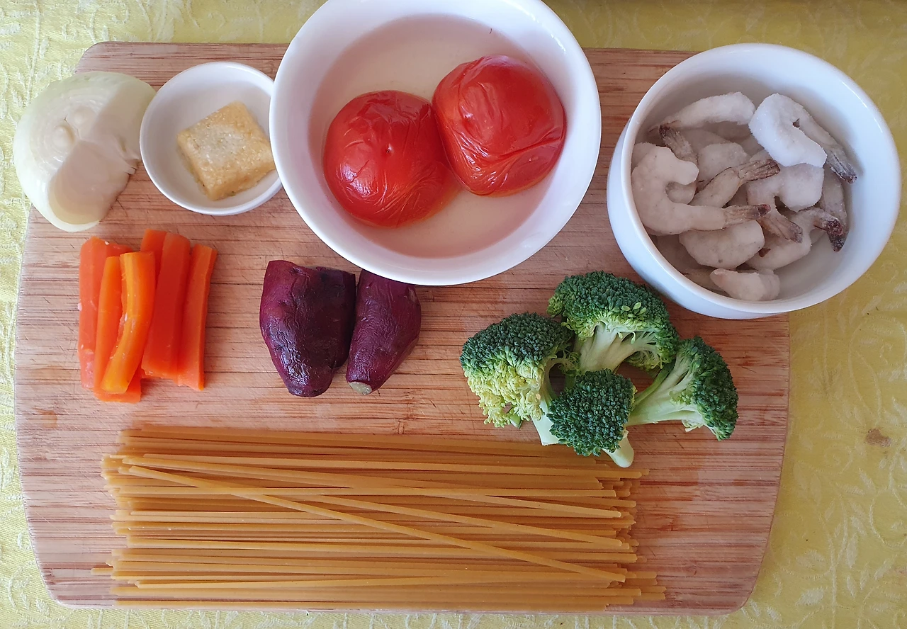 스파게티 면 100g의 열량은 365kcal, 감자는 55kcal, 고구마는 128kcal, 당근은 41.3kcal, 브로커리 33.7kcal이기 때문에 스파게티 면을 줄이고 다른 식재료를 넣어서 칼로리를 줄였고요.