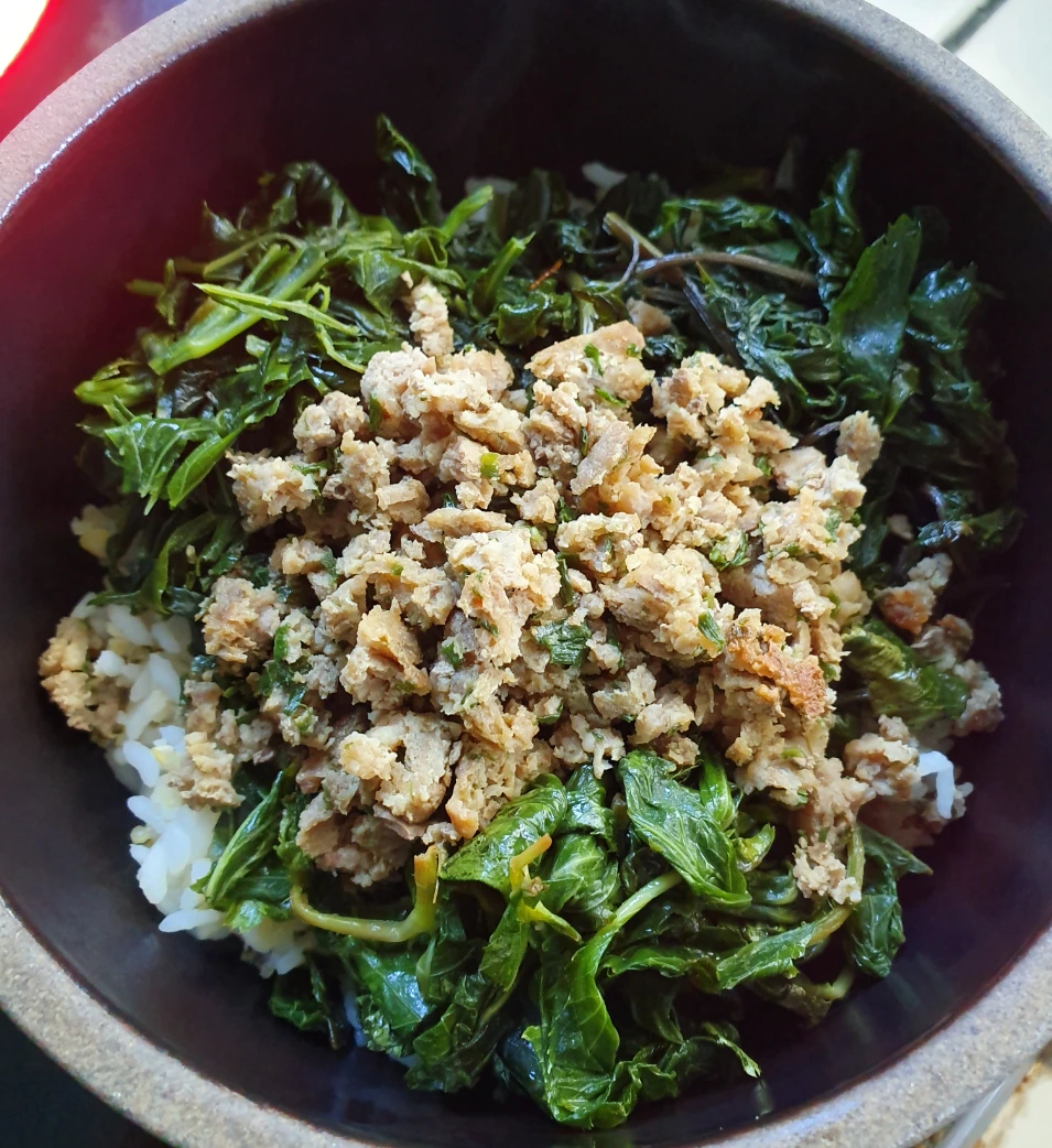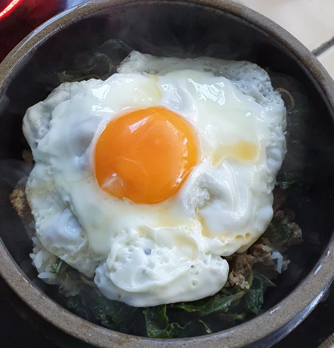 그리고 냉동실에 얼려 두었던 밥을 꺼내서 돌솥비빔밥을 만들었다.
