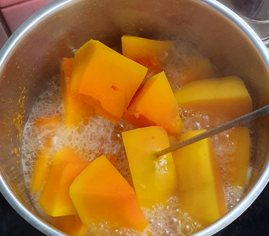 2. 적당한 크기로 자른 호박은 물을 반 컵 정도 붓고 중간 불로 푹 익혀주어요~