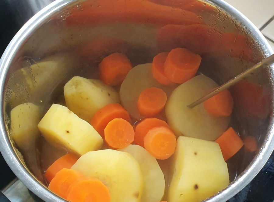 3. 당근과 고구마도 작게 썰어서 푹 익혀주어요~
