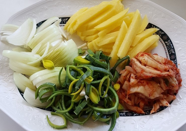 1. 양파, 감자, 파, 김치를 모두 송송 썰어 주어요~