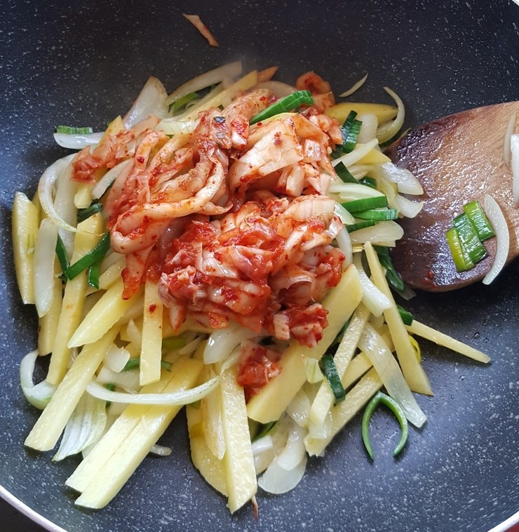 3. 감자와 김치를 넣고... 볶다가 육수나 물을 넣고 감자가 익을 정도로 뚜껑을 덮고 끓여 주어요...