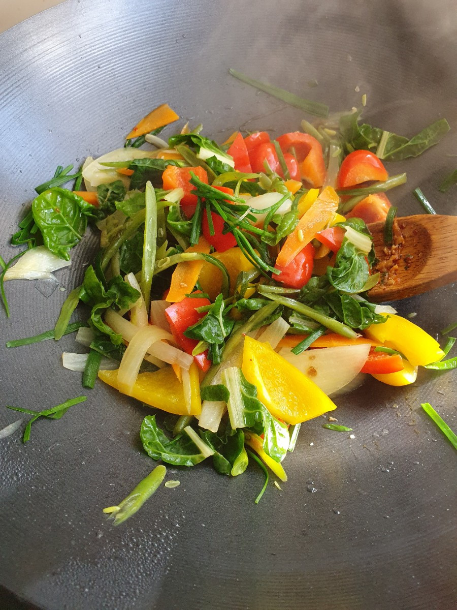 8. 기름을 조금 두르고 나머지 야채를 따로 볶아줍니다. 고기와 처음부터 같이 볶으면 야채가 너무 익거나 모양이 부서져 버려서 요리가 이쁘지가 않더라고요...