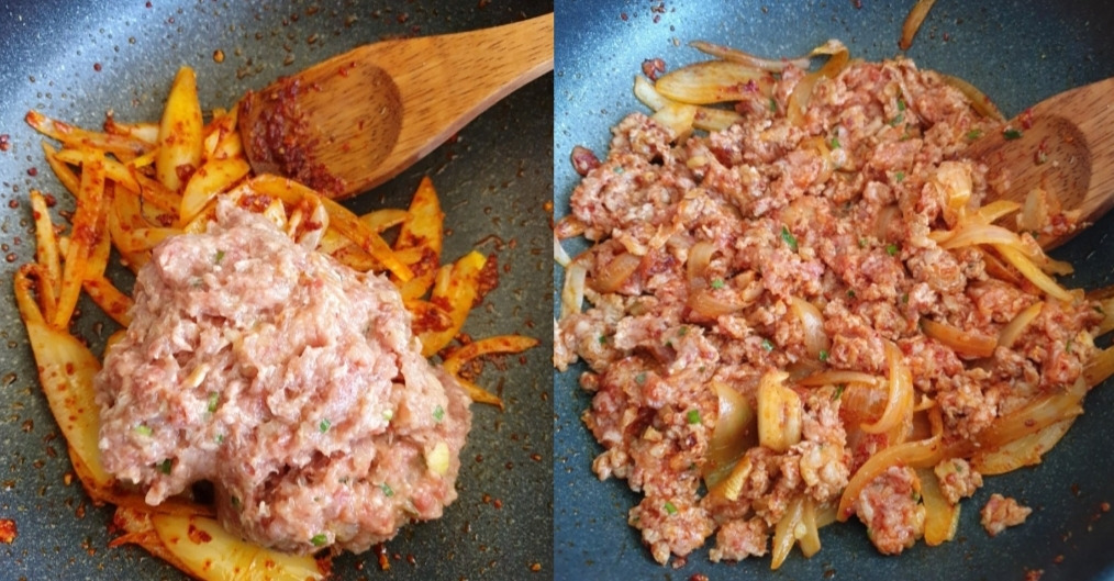 7. 양파가 어느 정도 익으면 양념해 둔 고기를 넣고 고기가 익을 때까지 볶아줍니다.