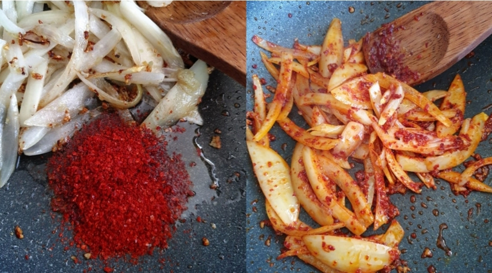 6. 프라이팬에 기름을 두르고 양파와 마늘을 볶다가 고춧가루를 넣어주고 고춧기름을 내듯이 볶아주어요~