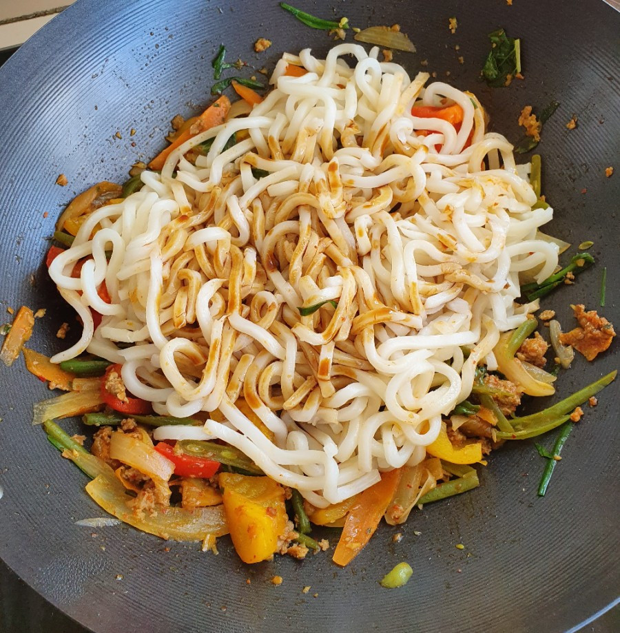 10. 삶은 우동을 넣고 준비해둔 소스 양념을 넣고 우동과 야채가 잘 어우러지게 볶아주고 마지막에 참기름을 조금 넣어주면 끝~~