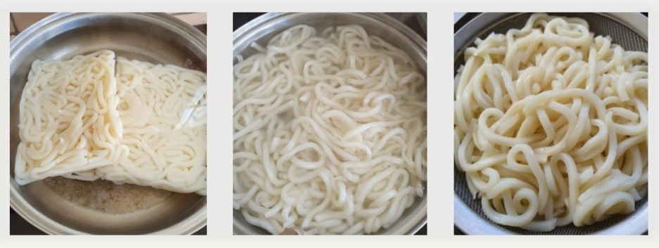 끓는 물에 우동을 넣고 집게로 면을 잡고 살살 흔들어주면 잘 풀려요~