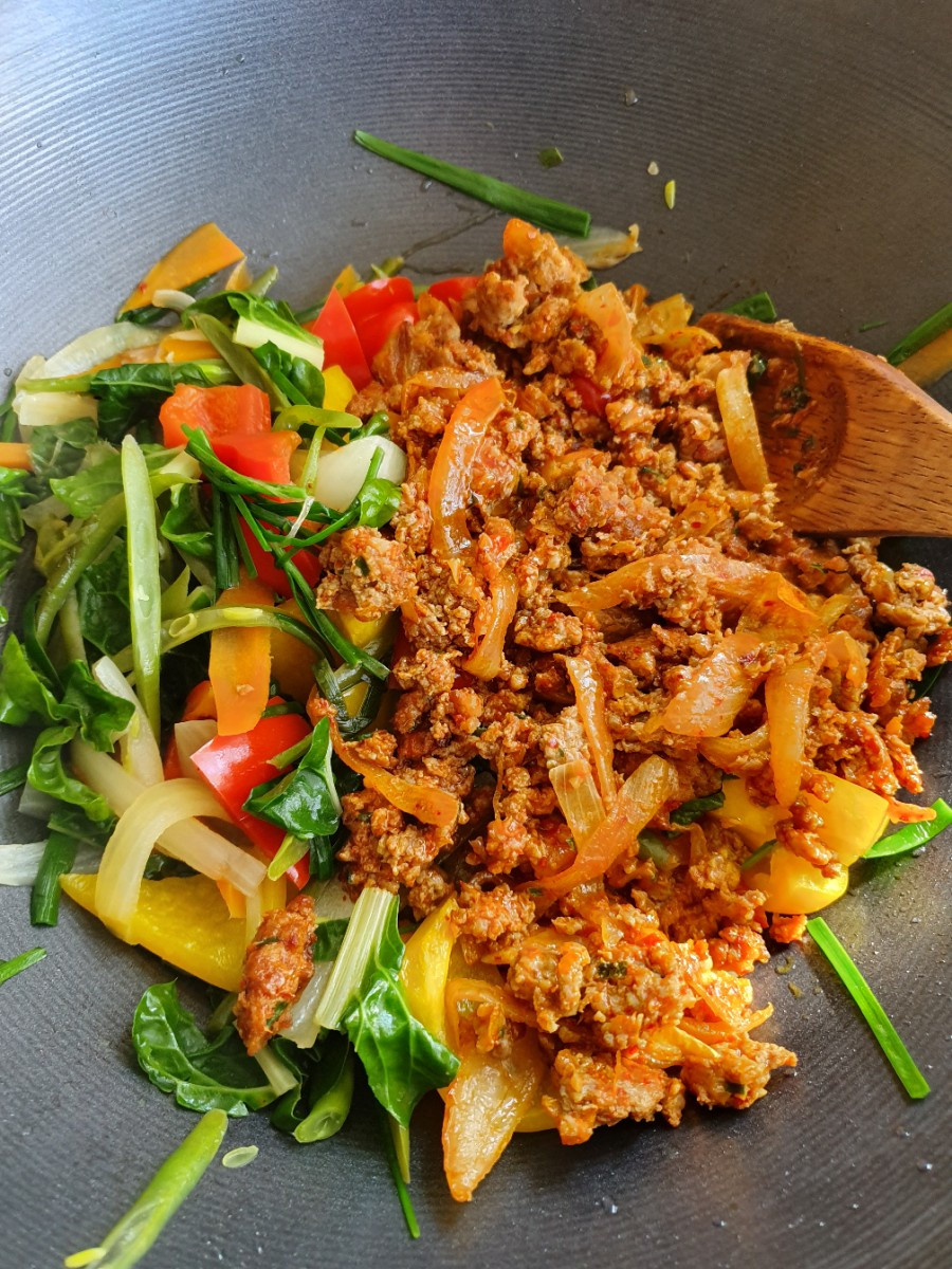 9. 볶아진 야채에 미리 볶아둔 고기를 넣고 한번 휘리릭 섞어주는 느낌으로 볶아줍니다.