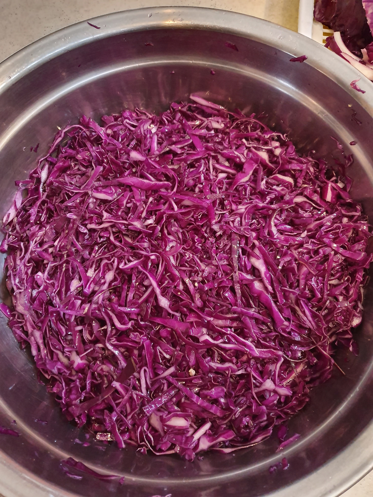 5. 숨이 죽은 양배추의 반은 사과 3개를 양배추처럼 채를 쳐서 함께 버물며 넣어주었고요~