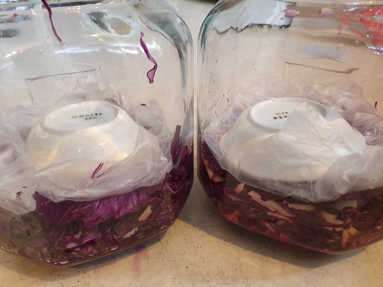 꼭꼭 눌러 담고 자연스럽게 생긴 물을 그 위에 붓고 나중에 먹을 병은 덮어두었던 양배추 껍질은 덮어 두어요 ^*^