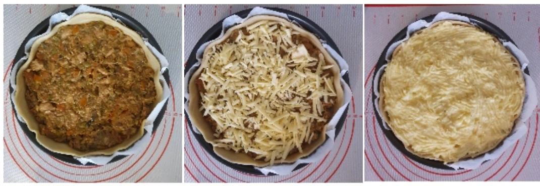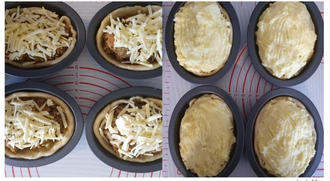 ** 큰 팬에 기름종이를 깔고 빵 반죽을 크게 밀어 깔고 그 위에 고기 속과 치즈 그리고 으깬 감자로 덮어주면~ 큼직하고 먹음직한 파이가 완성!!!