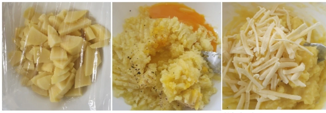 2. 뜨거울 때 버터를 넣고 익을 때까지 잠시 둔 후에 포크로 으깨주고 우유와 치즈, 소금, 후추, 계란 노른자를 넣고 잘 섞어준다.