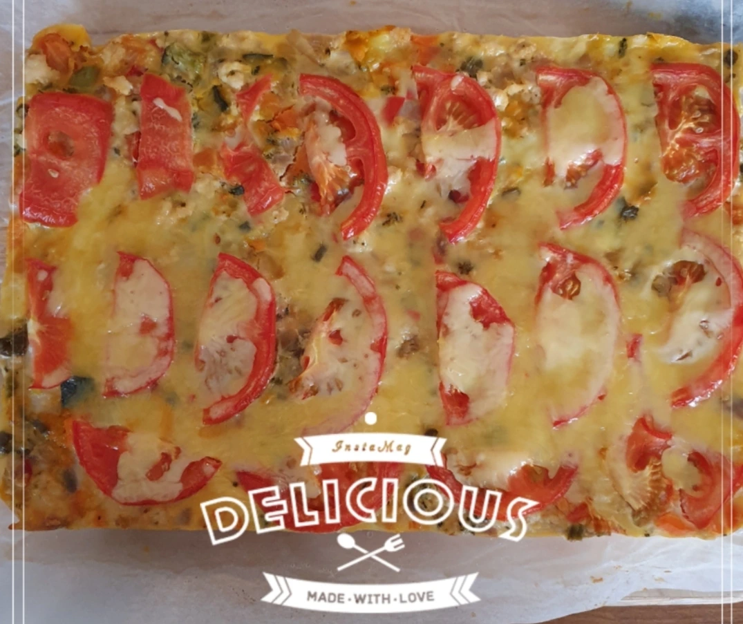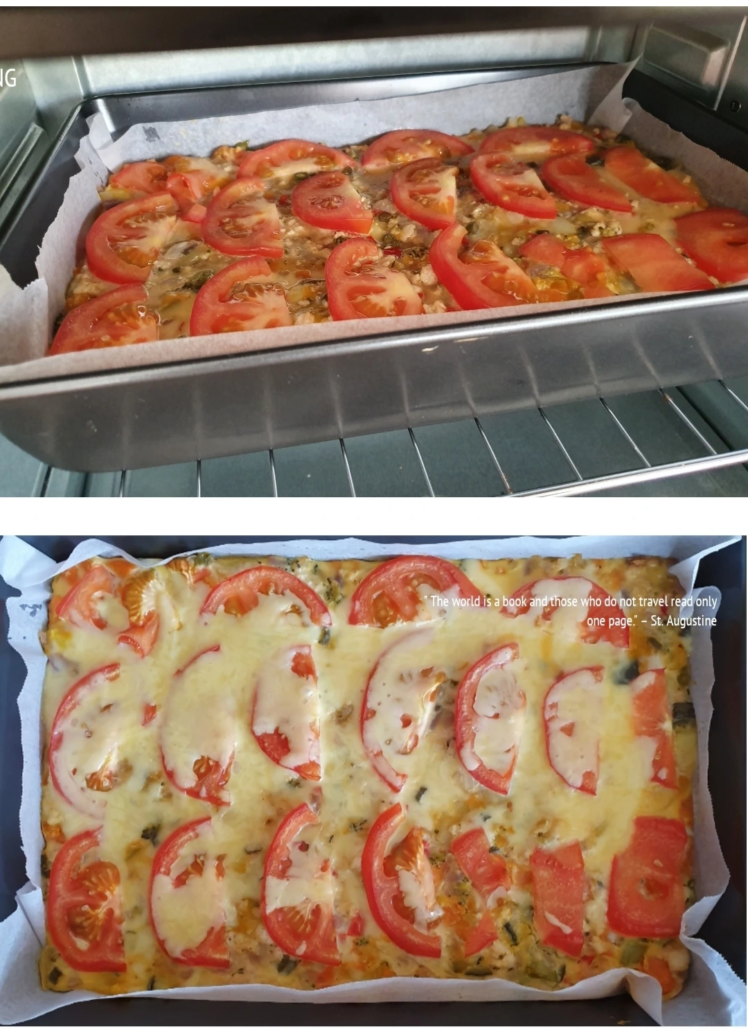 그리고 그 위에 계란과 우유 섞은 물을 골고루 부어주고 토마토를 썰어 위에 얹어주면 끝~~