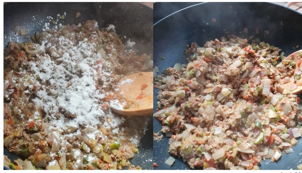 물이 부족하면 물(육스)을 조금 부어주고 푹 익혀주시고.... 다 익었는데 물기가 있으면 밀가루를 솔솔 뿌린 후에 볶아주어 물기를 모두 없애줍니다.